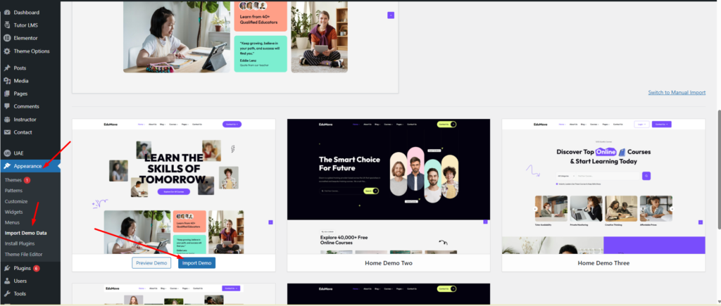 After installing and activating the recommended plugins, please go to Appearance → Import Demo Data and click ‘Import Demo Data.’ Wait a few minutes, and once the process is complete, the demo data will be successfully imported.