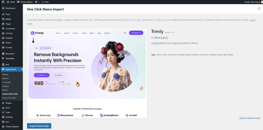 After installing and activating the recommended plugins, please go to Appearance → Import Demo Data and click ‘Import Demo Data.’ Wait a few minutes, and once the process is complete, the demo data will be successfully imported.